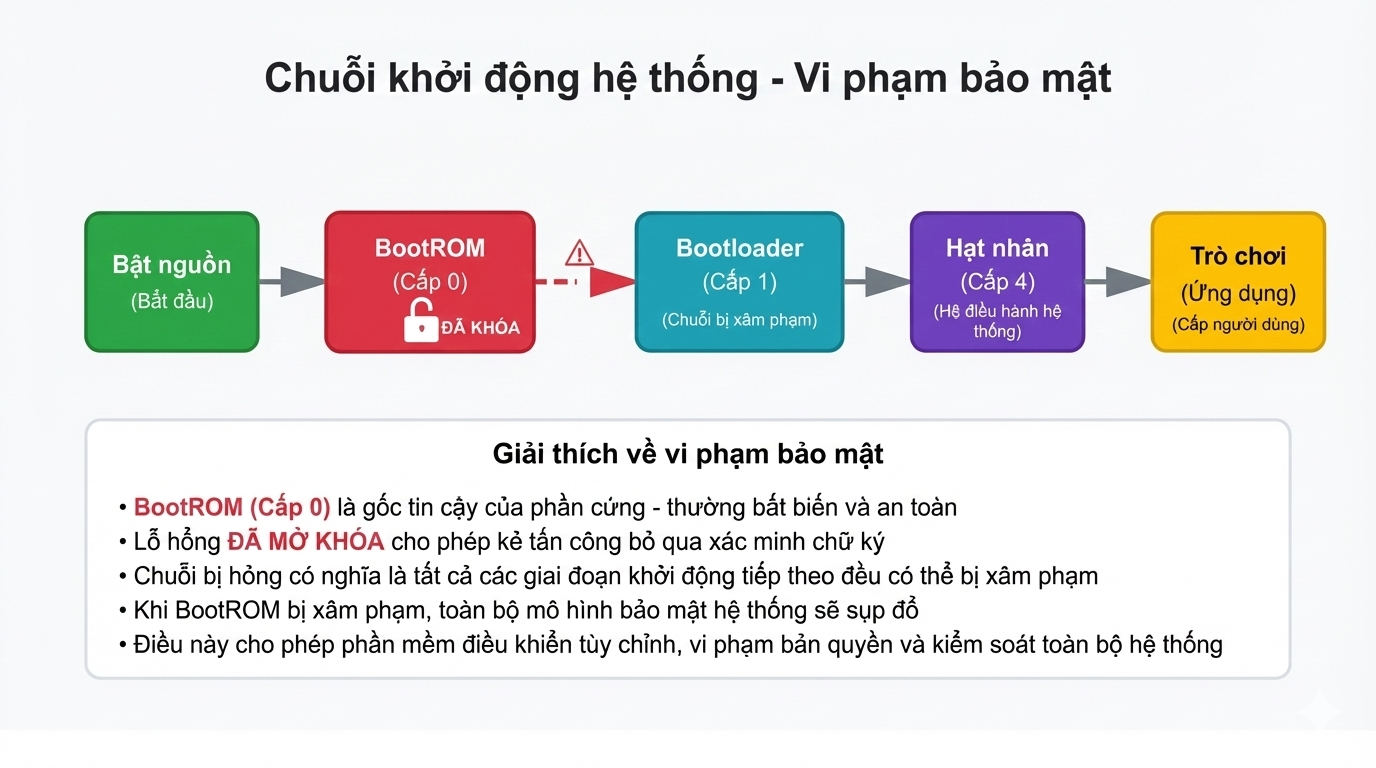 Phần bị lộ là các mã BootROM, được xem là tuyến phòng thủ đầu tiên của PS5 khi khởi động. BootROM chịu trách nhiệm xác minh bootloader, đảm bảo rằng quá trình khởi động không bị can thiệp và chỉ chạy mã hợp lệ do Sony ký xác thực.